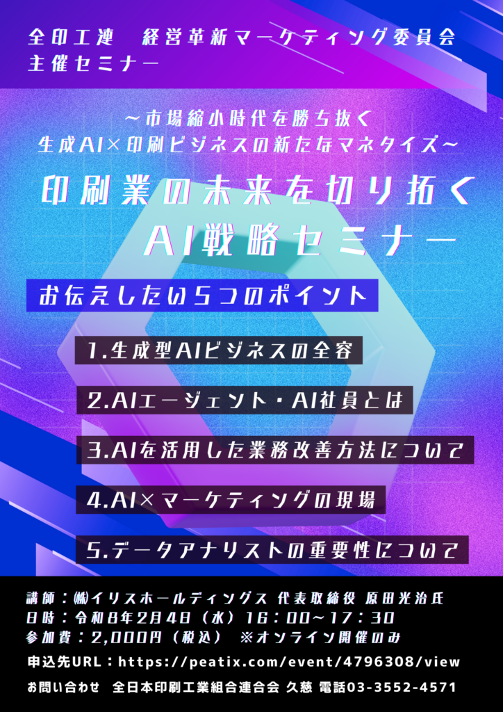 印刷産業は市場縮小が続く中、大きな転換期を迎えており、その変化を加速させているのが「AI」です。AIの活用可否は、今後の企業成長を左右する重要な分岐点となりつつあります。本セミナーでは、印刷マーケティングの実務経験をもとに、AIを印刷ビジネスへどのように取り入れ、収益化していくのかを事例とともに解説します。業務改善やマーケティング、データ活用の視点から、これからの印刷会社が目指すべきビジネスモデルを学んでいただける内容です。AIを「脅威」ではなく「武器」として活用するためのヒントを得られる機会として、ぜひご参加ください。詳細は下記をご覧ください。